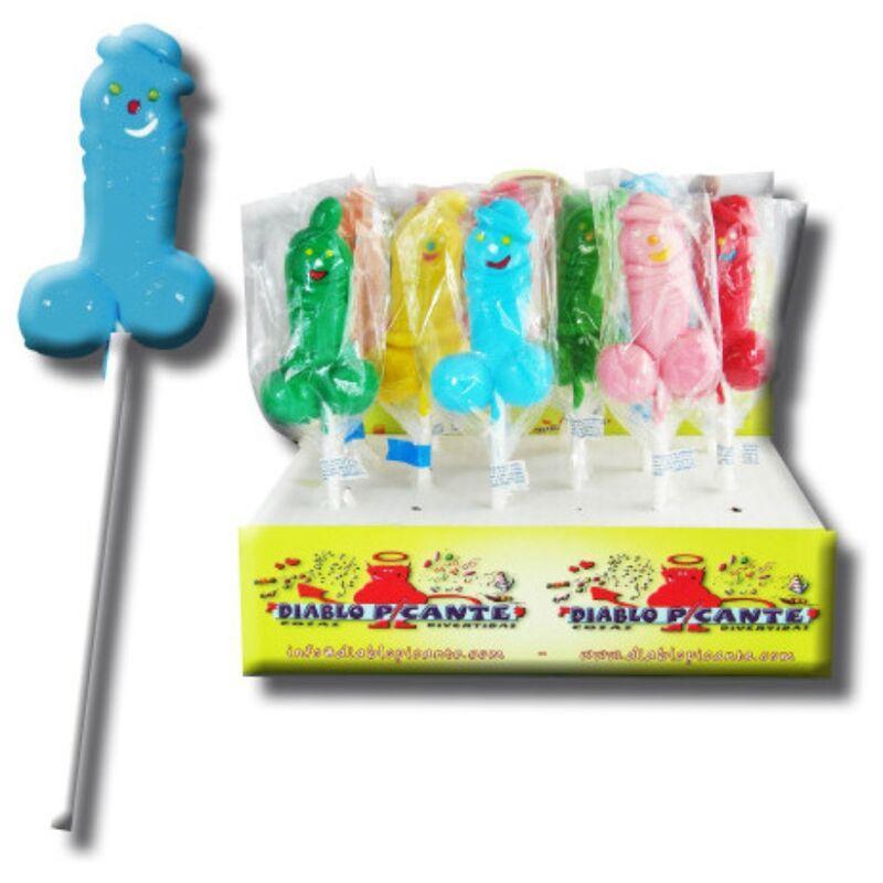 Piruleta con forma de pene con caritas con sabor frutas variadas.